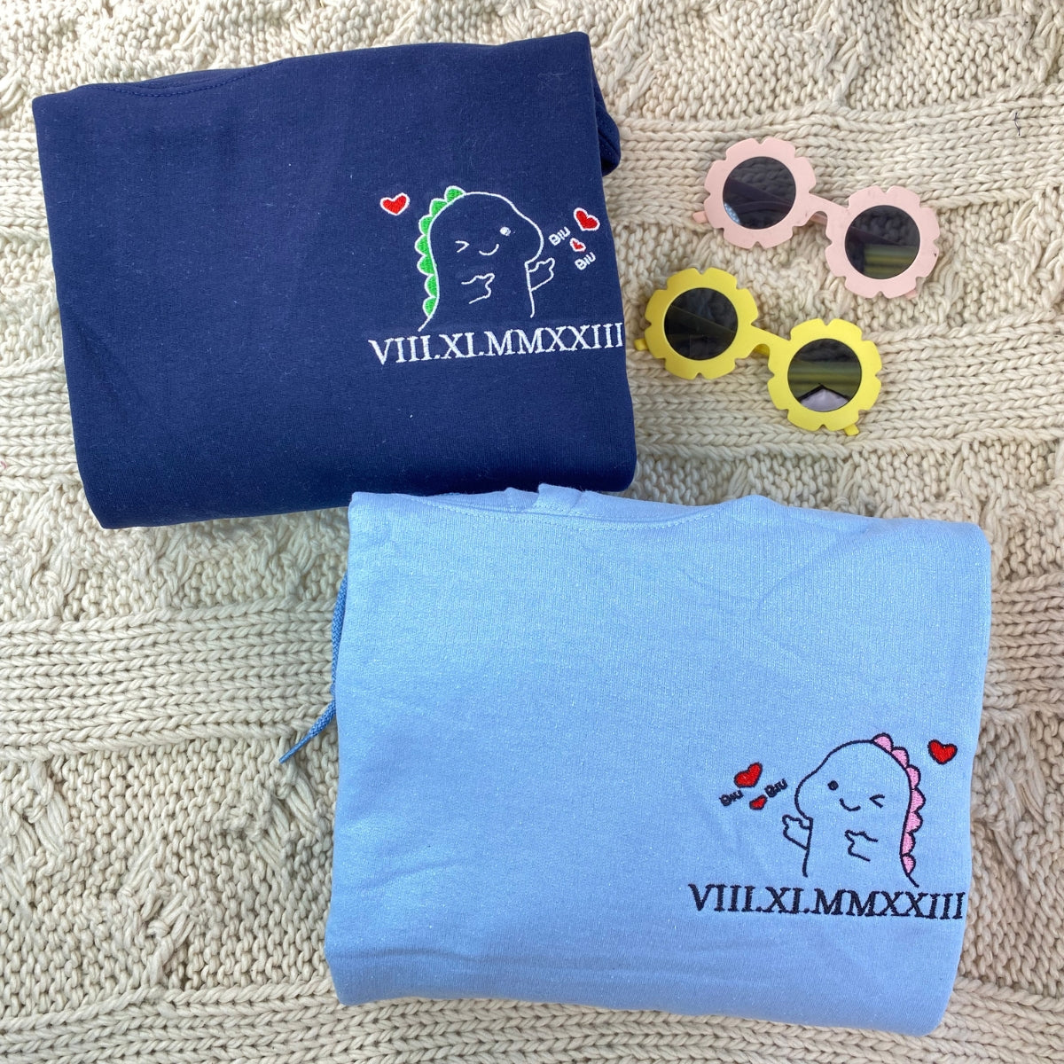 Cute Dino Couple Custom Roman Numeral Matching Embroidered Hoodies For Couples