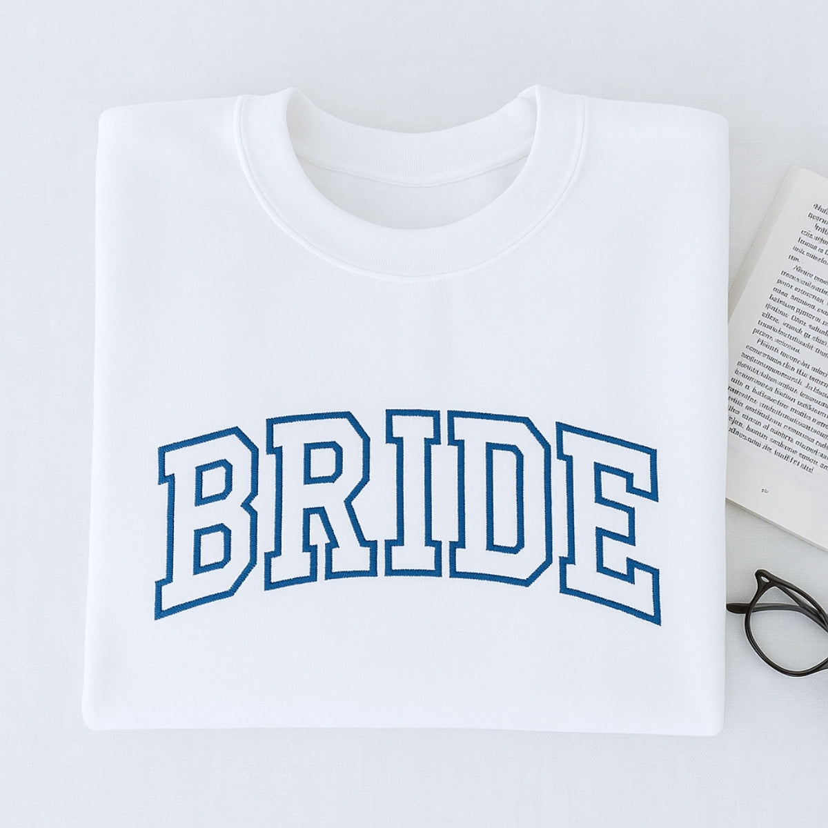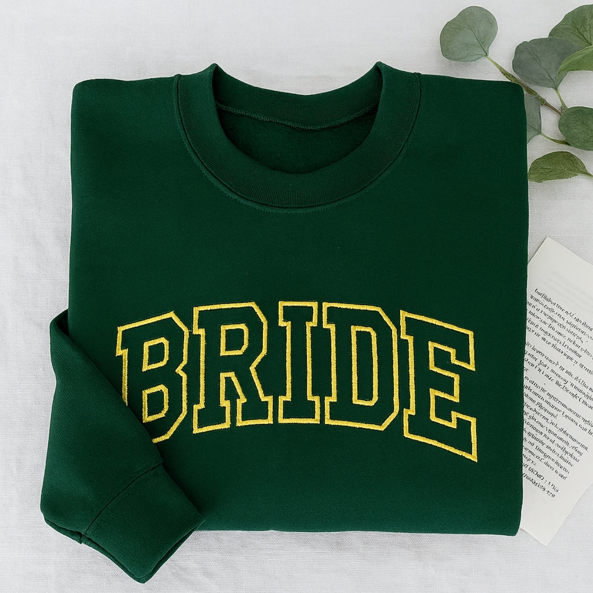 Score big on your wedding day with this varsity-style Bride sweatshirt featuring bold collegiate embroidery. Perfect for brides who love a sporty, casual vibe during bachelorette parties, bridal showers, and wedding weekend festivities. The classic varsity lettering adds a fun, modern twist to traditional bridal apparel. High-quality embroidery on comfortable sweatshirt material makes this ideal for active celebrations, sports-themed weddings, or any bride who wants to show her team spirit. Great for photo ops and comfortable enough for all-day wear.