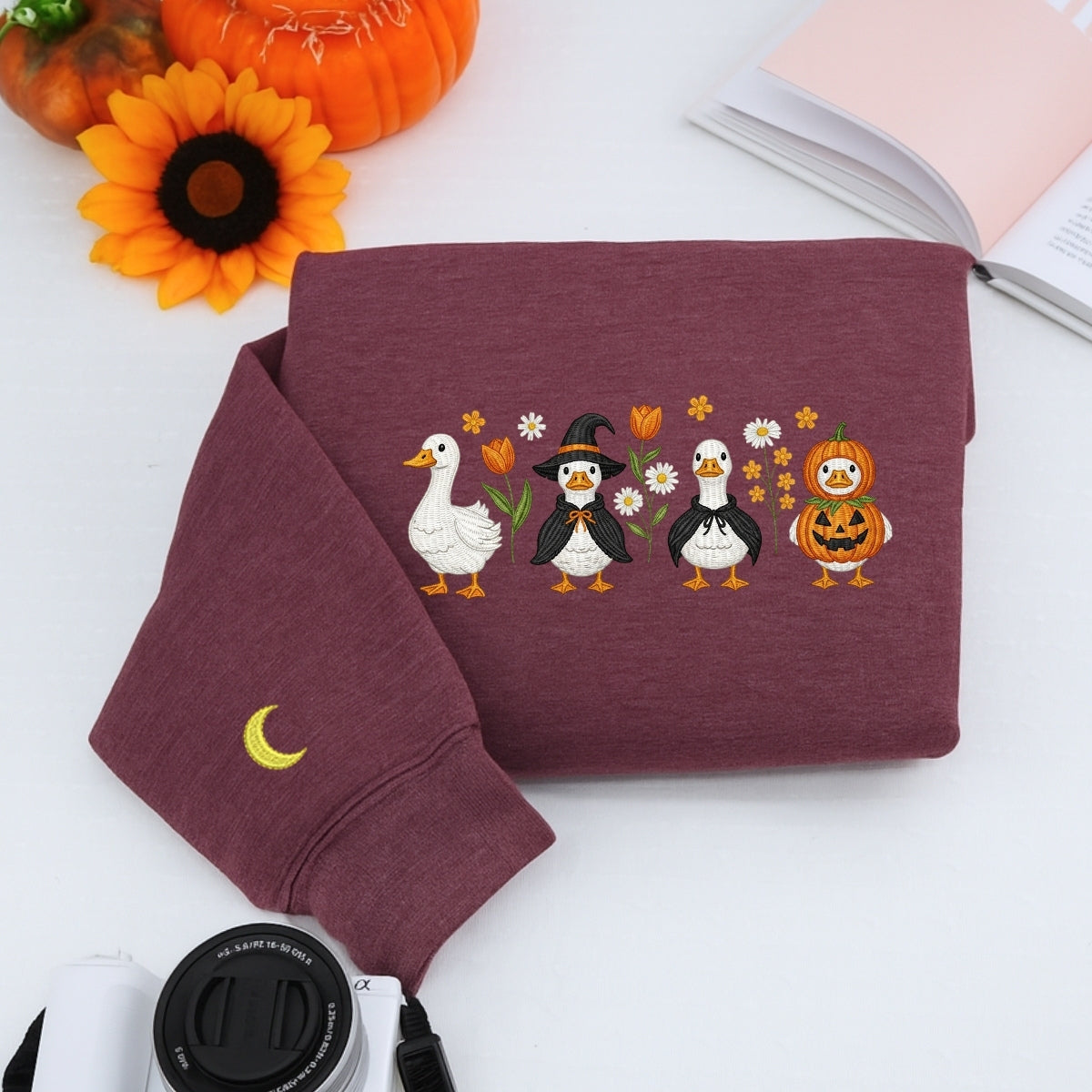 Halloween geese custom sweatshirts featuring four charming embroidered geese dressed in adorable Halloween costumes including ghost, witch, autumn harvest, and jack-o'-lantern themes, accented with delicate floral details. This viral Halloween design combines the internet's favorite goose trend with sophisticated embroidery work, creating premium apparel that's perfect for everyday Halloween style. The detailed embroidery showcases each goose's unique costume with beautiful autumn florals creating a whimsical garden scene. High-quality embroidered artwork on comfortable vintage-style sweatshirts makes these ideal for casual Halloween wear, autumn gatherings, or anyone who loves cute seasonal fashion.